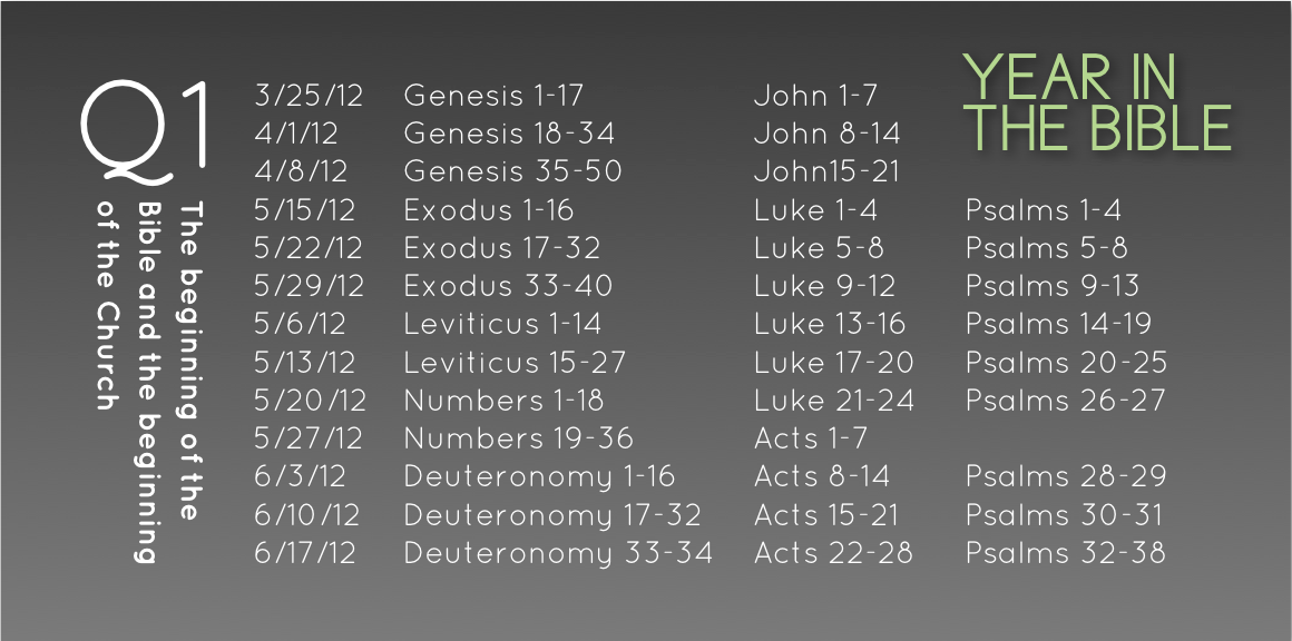 For those who have yet to see the spread sheet in the Reading List, here is the reading for Quarter 1–the beginning of the Bible and the beginning of the Church, in a more visually appealing form.