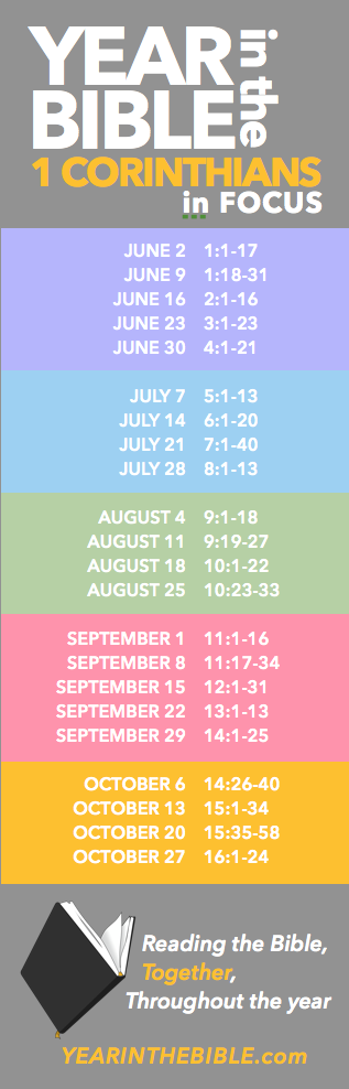 A good way to look back and review our readings is with our memory verses. I’d encourage you to reread the previous sections as much as you can as we work our way through 1 Corinthians, but these short verses can be a fine short cut.