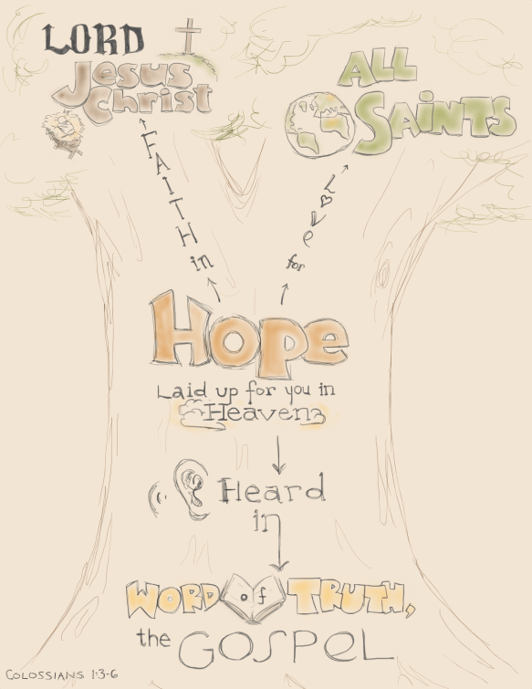 You may have noticed by now that Paul likes to use long sentences. This is one good reason to slow down and make sure you’re understanding what he writes. The picture from Monday centers in on ‘hope’ and I did this because although it comes later in the passage, we hear that it is a cause for the faith and love about which Paul has heard. Their hope–their goal, their promise–spurs them on to have greater faith in Christ and to spread his love to others. Christians who journey toward the goal, who are bound to the hope we have in Christ, should exhibit in that journey the characteristics that arise from that hope: love and faith.