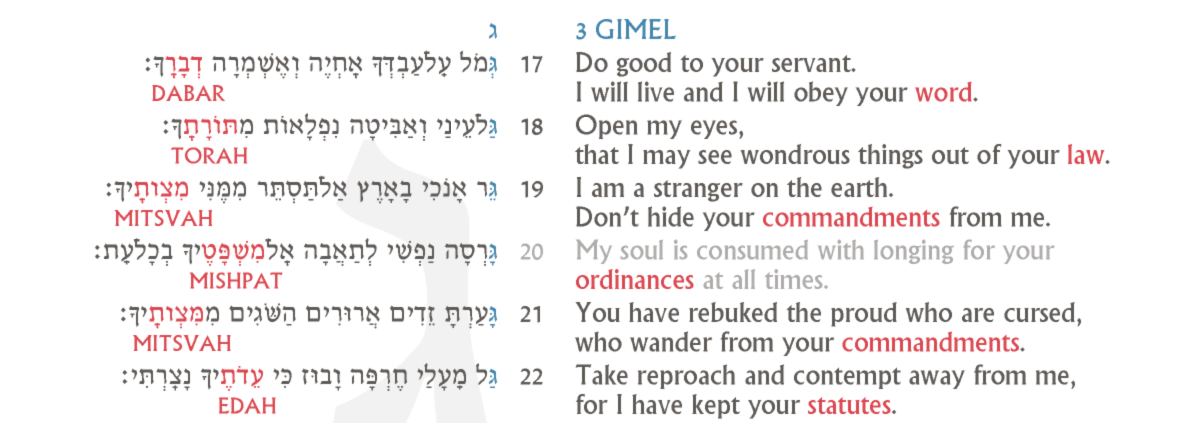 I found this some months back and it emphasizes the acrostic nature of the poem (how each line of the stanza begins with the same letter, with the proceeding stanzas moving along through the Hebrew alphabet). It also points out the place that God’s Word holds throughout the psalm. The way this site puts it is this: